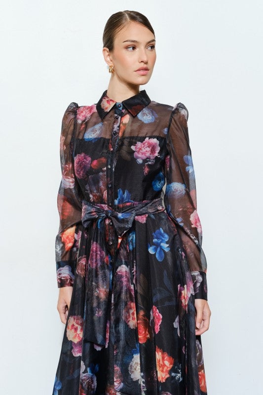 Black Floral Organza Puff Sleeve Belted Shirt Dress