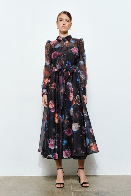 Floral Organza Puff Sleeve Belted Shirt Dress