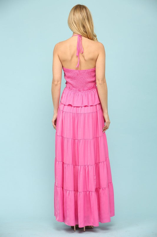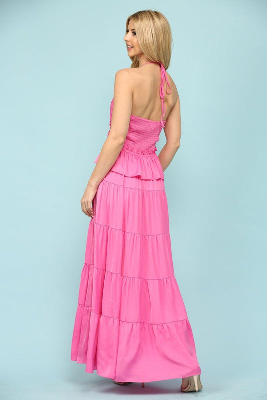 Fuchsia Shiny Woven Halter Neck Strap Key Hole Front Midi