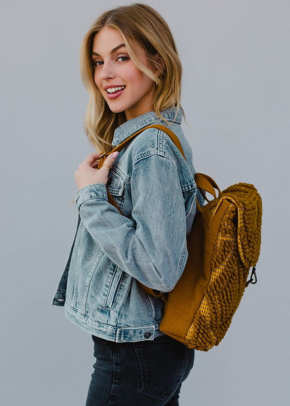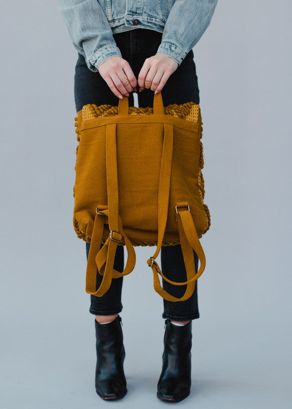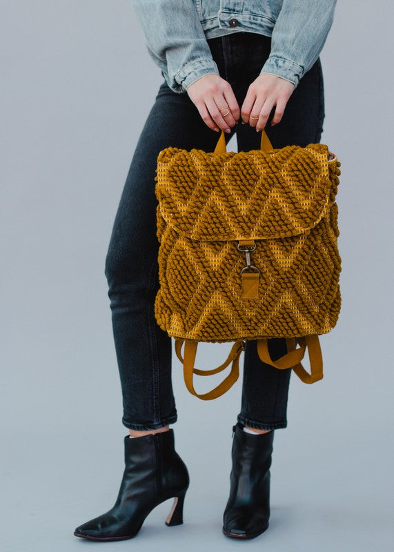 Mustard Textured Diamond Pattern BackpackClasp Closure On Front Adjustable Straps & Handle14" X 11.5" X 4.5"Material Composition100% CottonDimension14 W X 11.5 L X 4.5 H(Inch)
