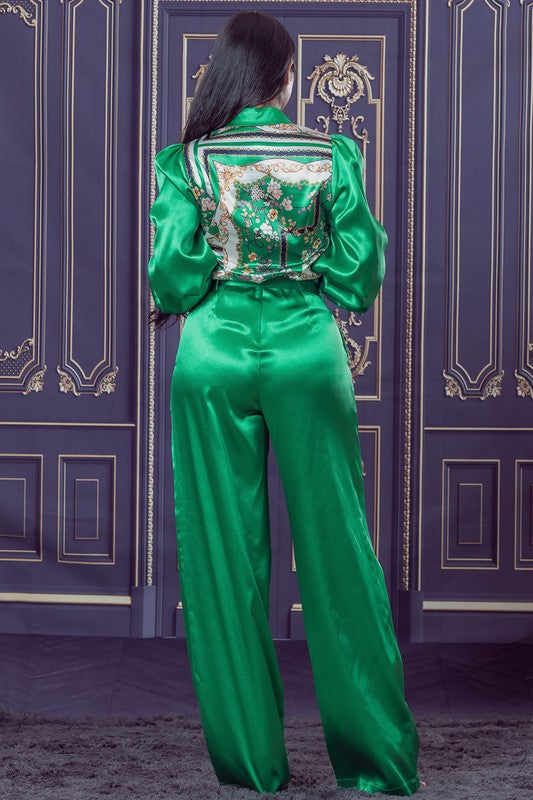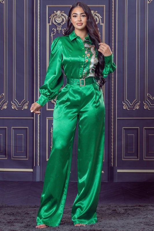 -Details: Puff Sleeve, Adjustable Belt, Side Pockets, Front Button Closure, Long Sleeve, Wide Leg, Collar, Long Sleeve.