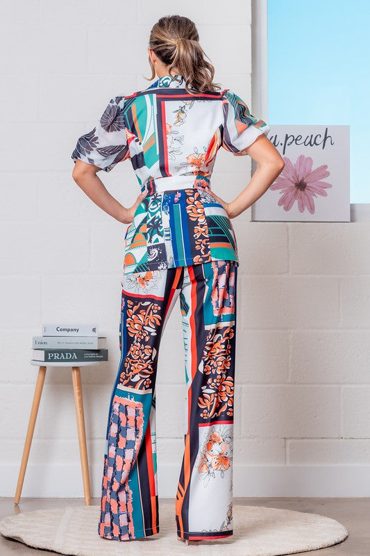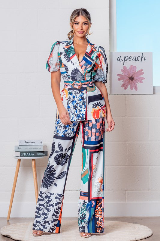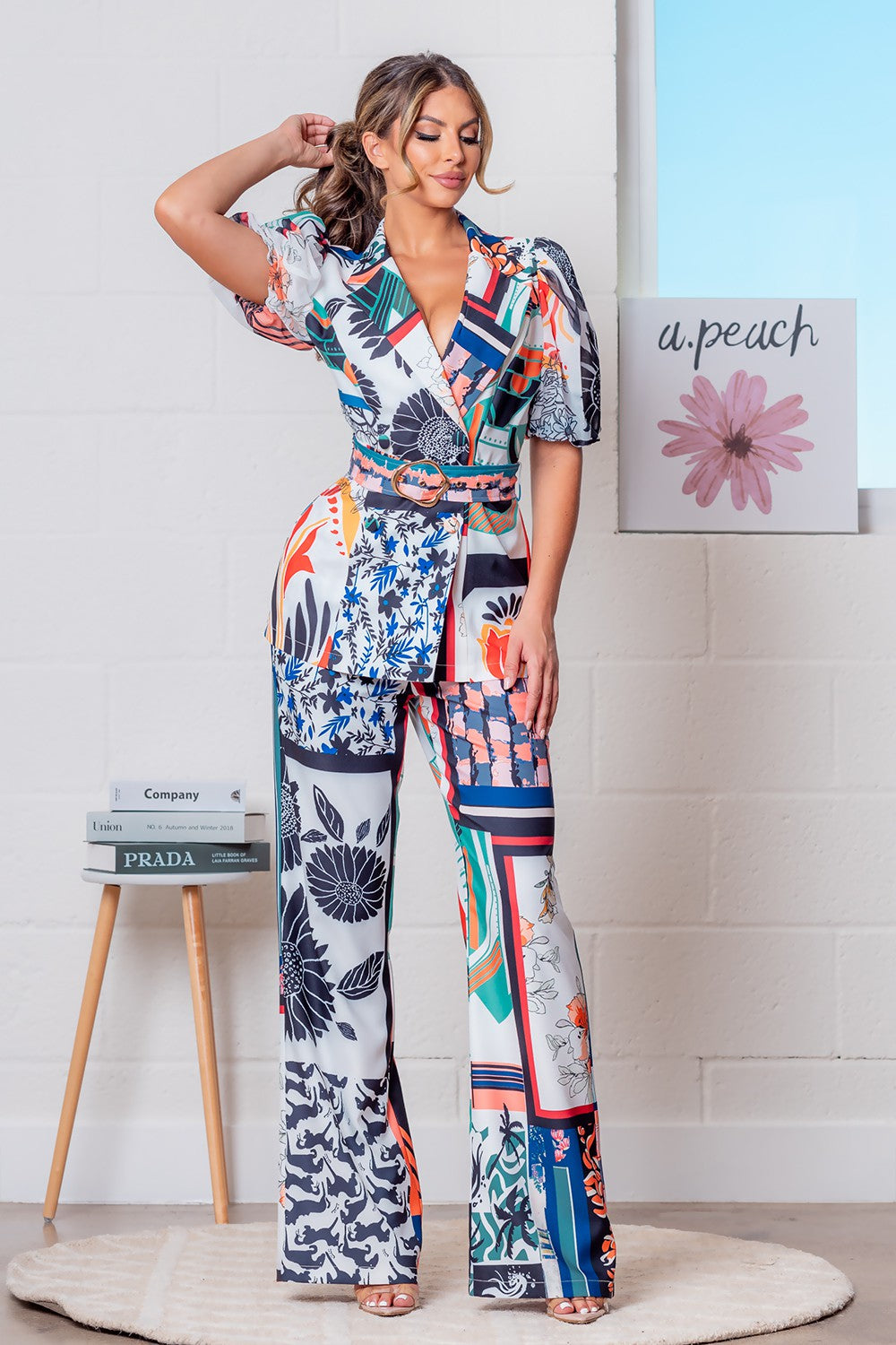 -Details: Adjustable Belt, Double Breasted Blazer, Wide Leg, Back Concealed Zipper, Elastic Band Waist, Side Pockets, Printed.
