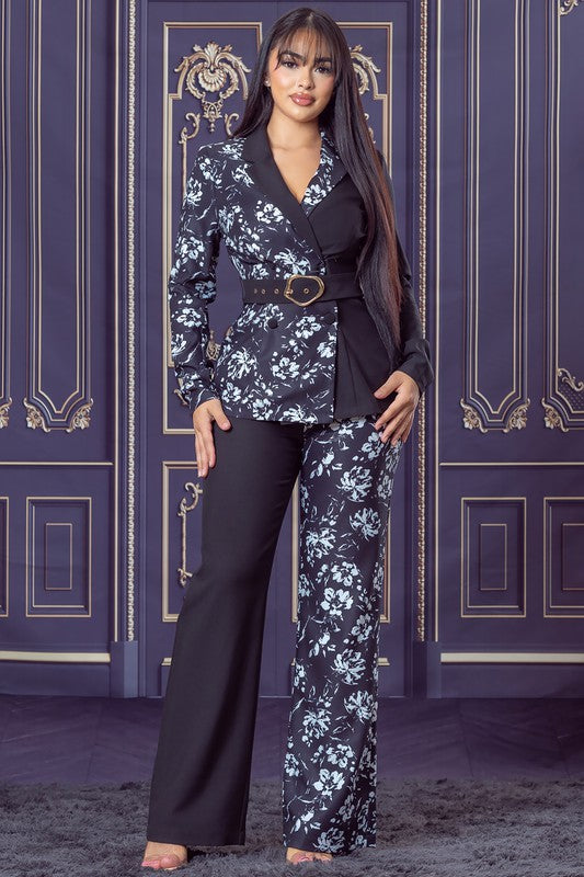 -Details: Adjustable Belt, Surplice, Double Breasted, Collar, High Waist, Hem Pants, Color Block, Floral Print, Side Pockets.