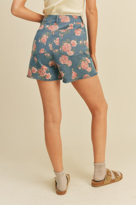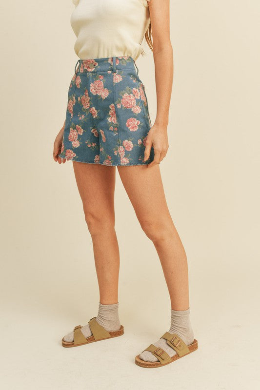 + High Waist Floral Denim Shorts+ Raw Edge Hem+ High Rise Waistband With Belt Loops+ Hidden Zip Fly And Button Closure+ Back Pockets+ Model Is 5' 10" 33-24-37 And Wears A S
