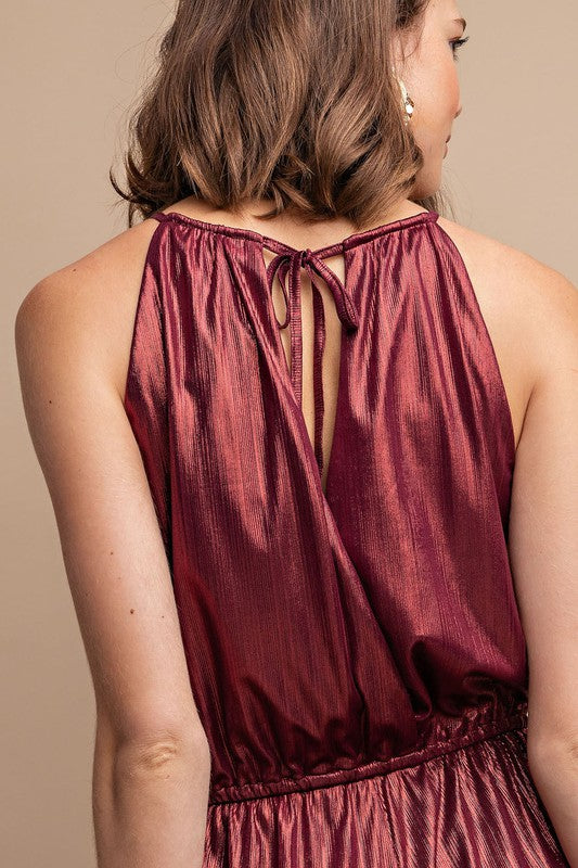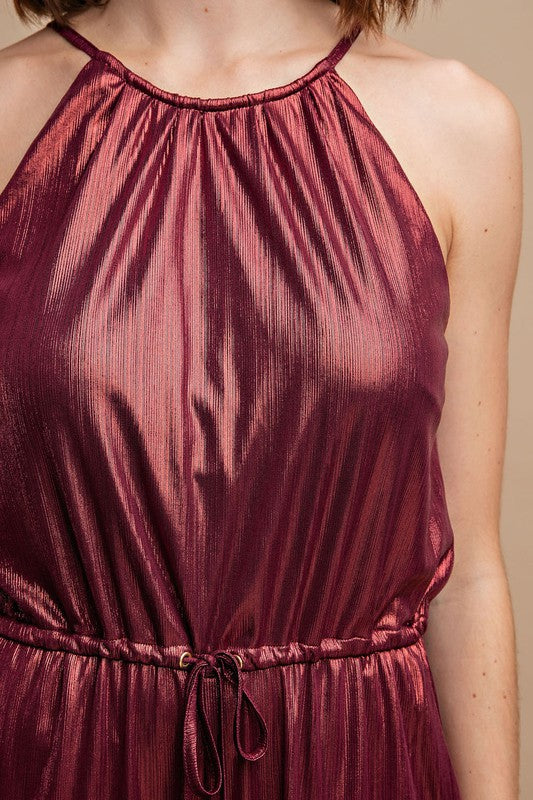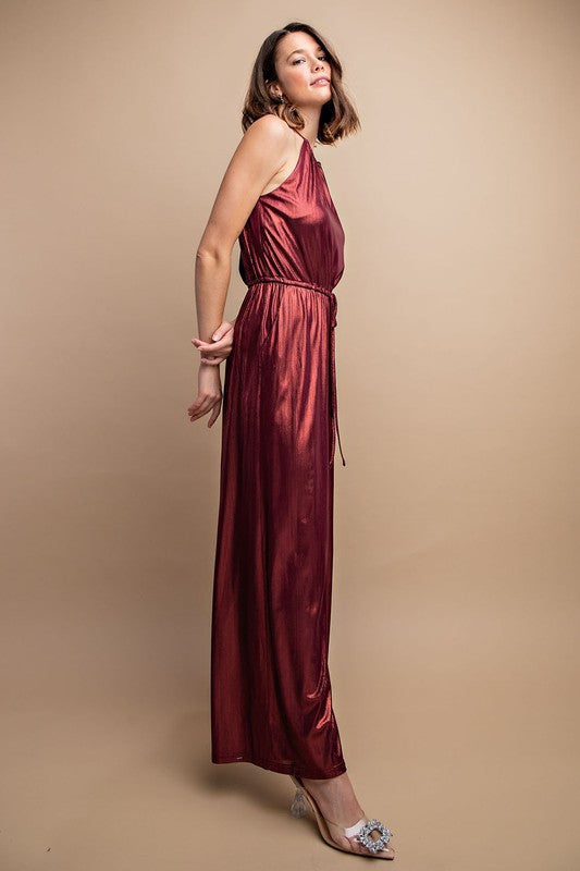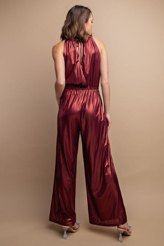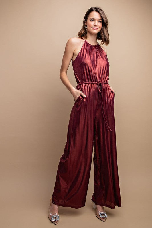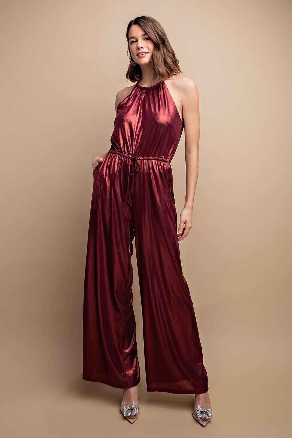 Metallic Drawstring Waist Jumpsuit With Back TieModels Are 5'7" And 5'8" Both Wearing A Small.Fabric Contents95% Polyester, 5% Spandex