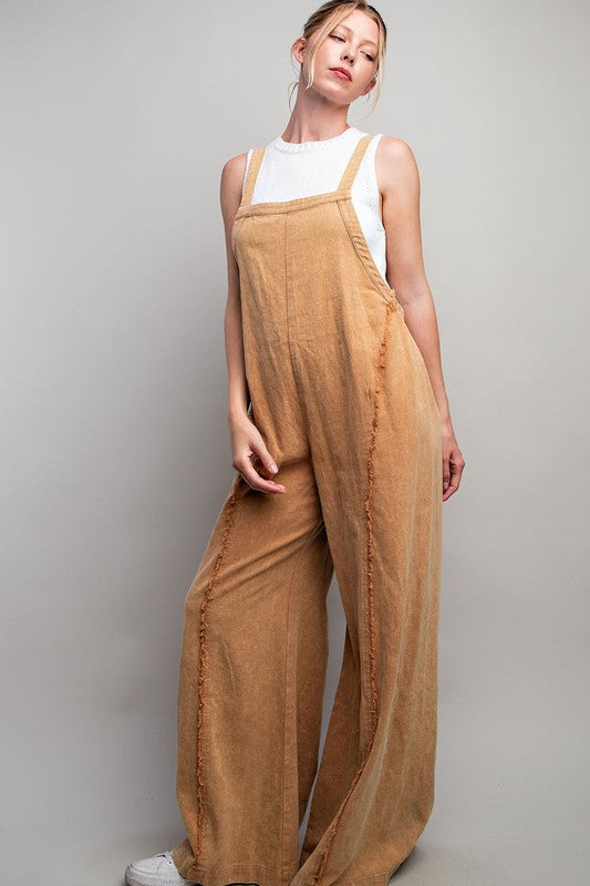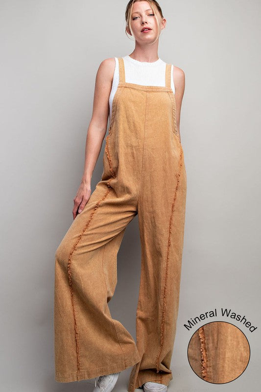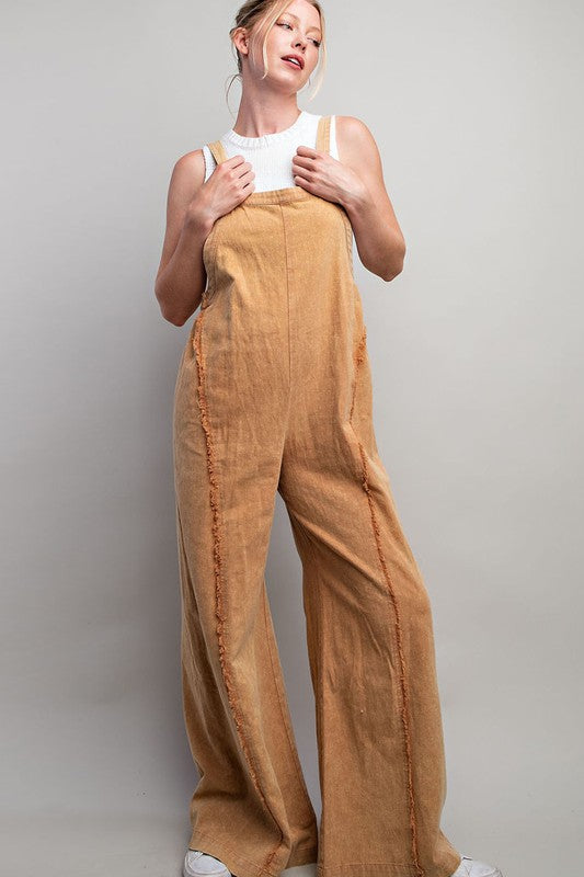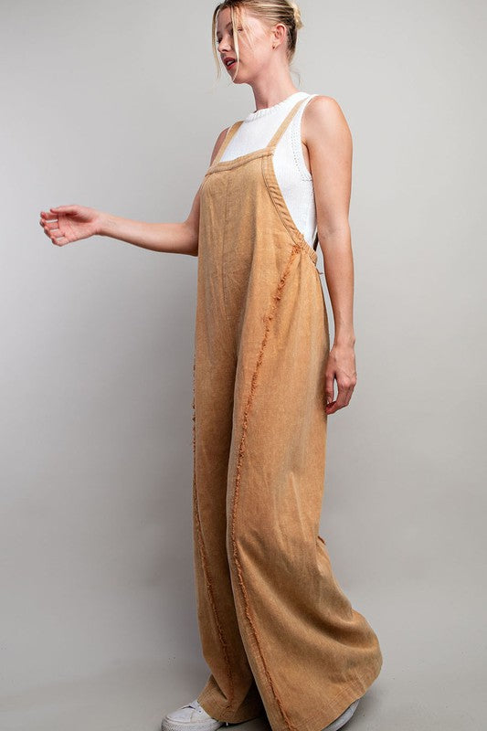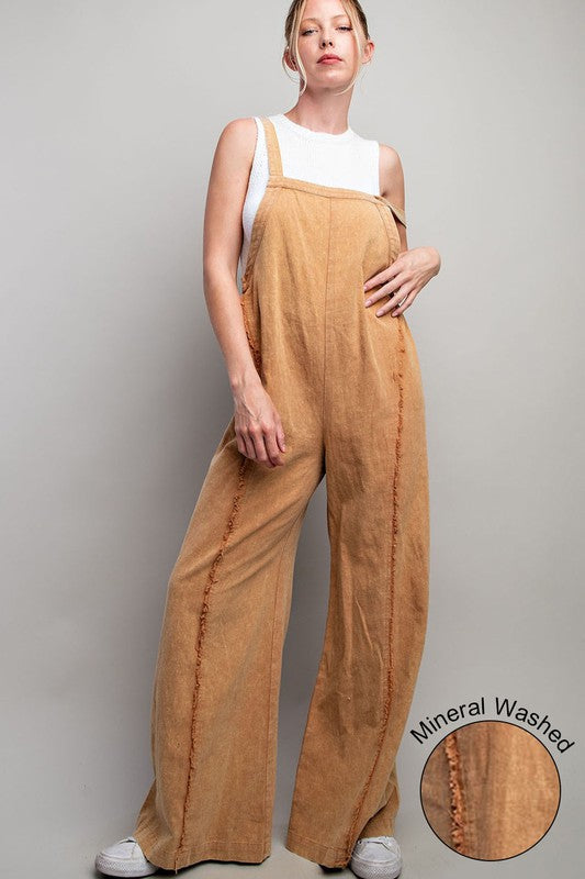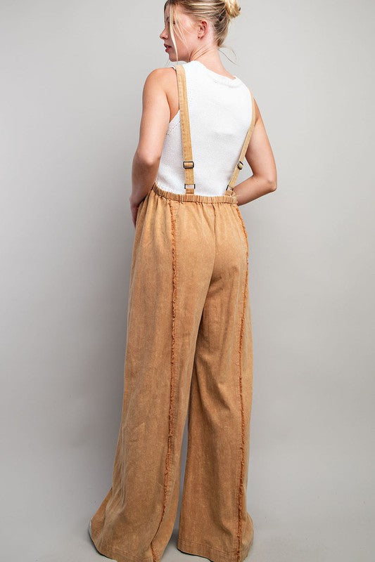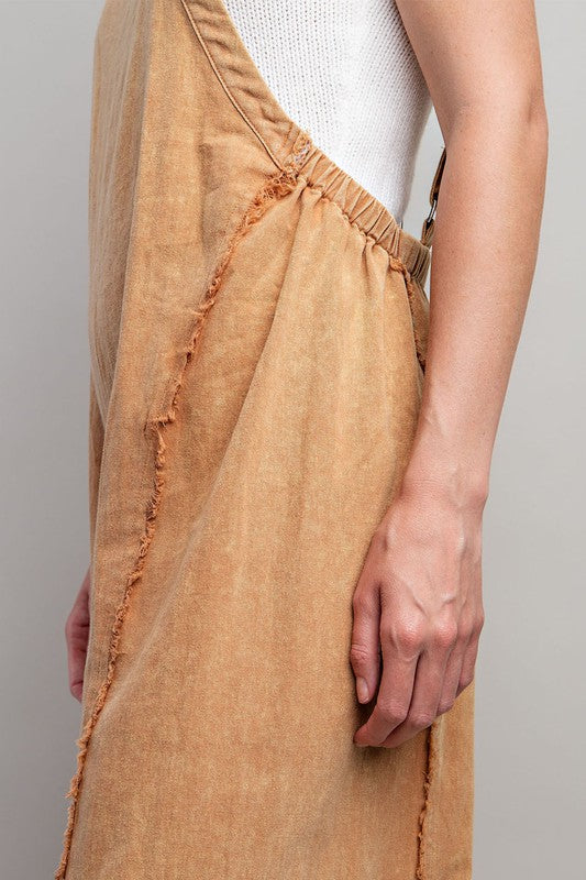 Mineral Washed Sleeveless Jumpsuit Featuring Adjustable Straps, An Elastic Waistband In The Back For Added Comfort And Frayed Seams For Detail.