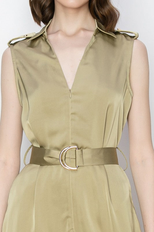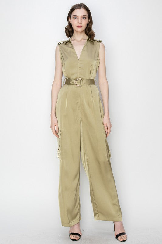 Olive Satin V-Neck Side Pockets Cargo Pants Jumpsuit