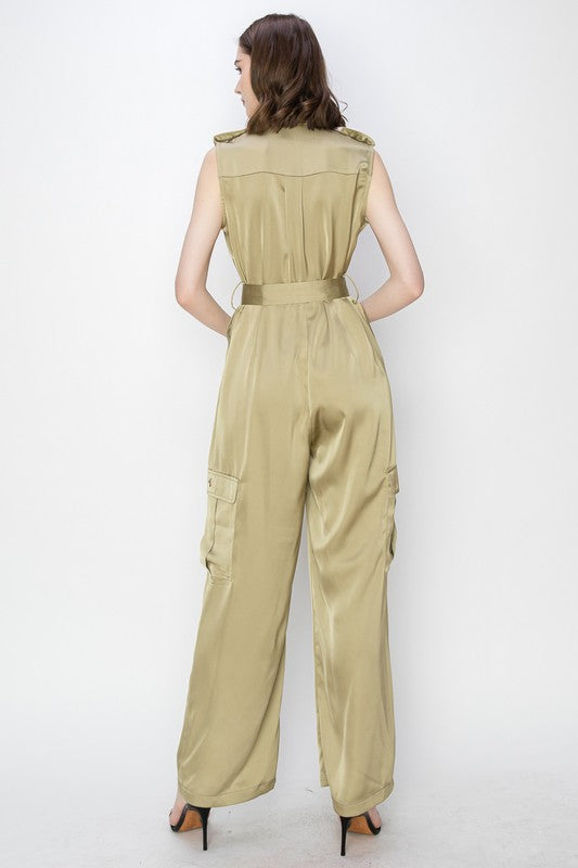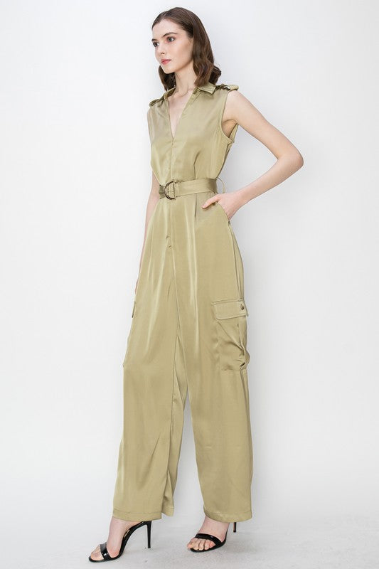 Satin V-Neck Side Pockets Cargo Pants Jumpsuit