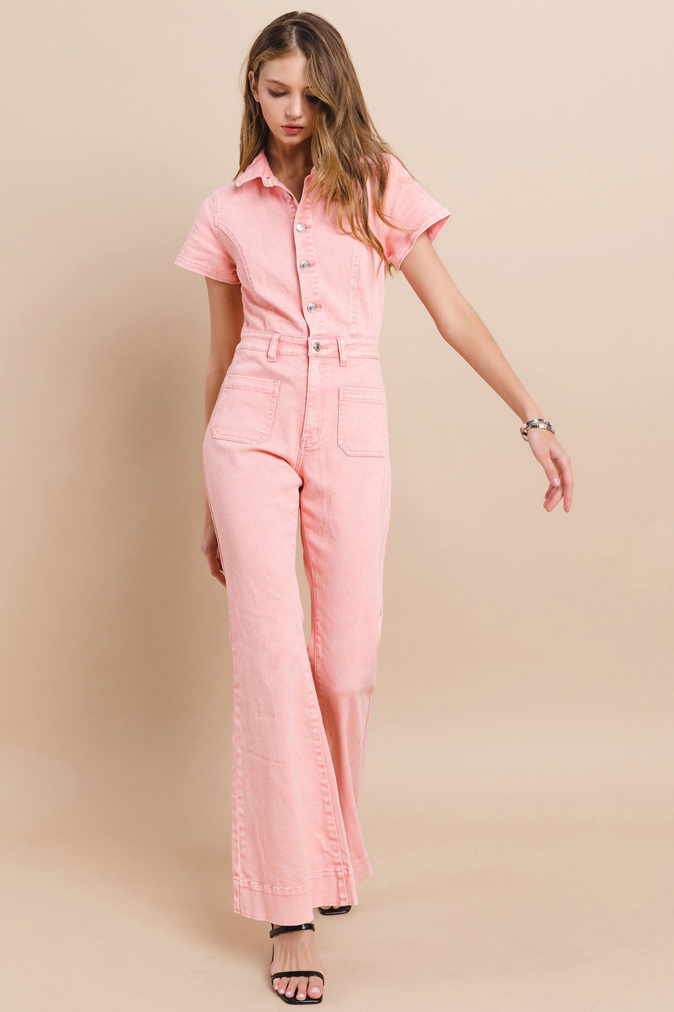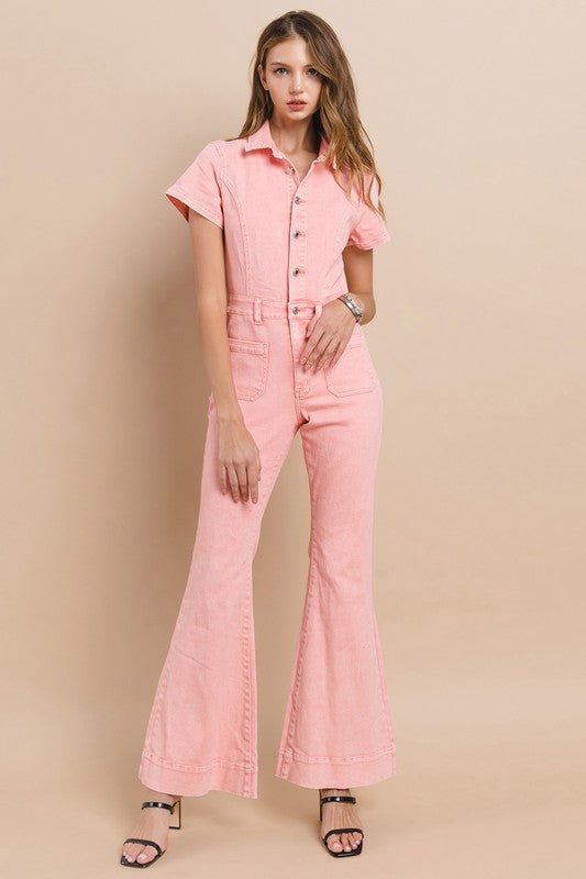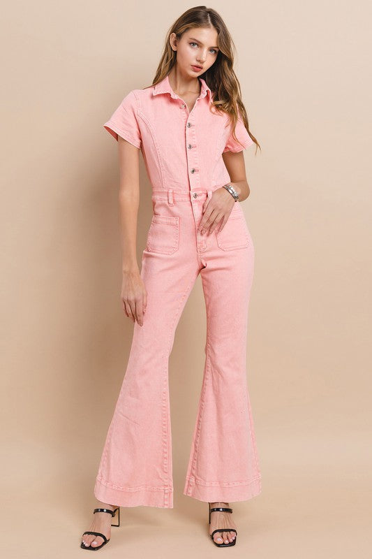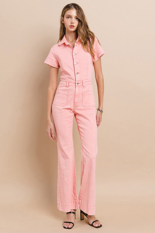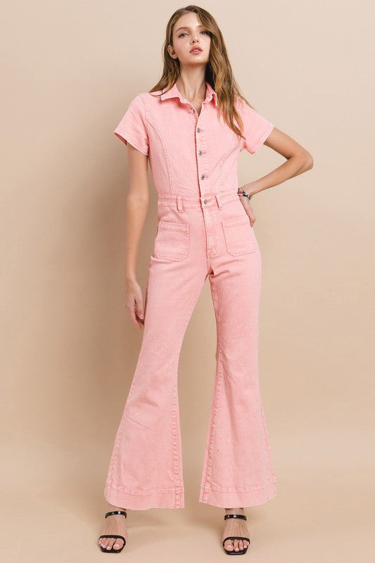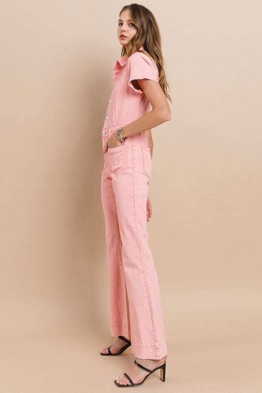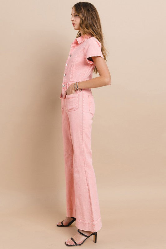 Petite (Inseam 31") Full Length Denim Jumpsuit With Functional Buttons And High Stretch