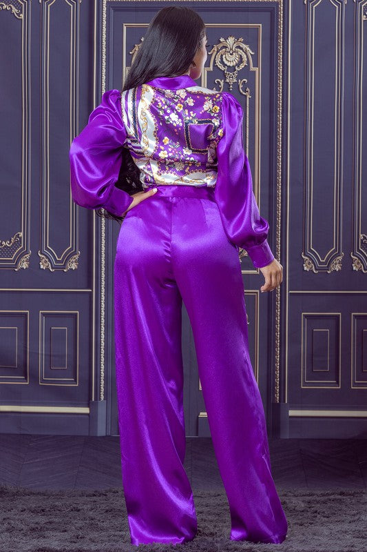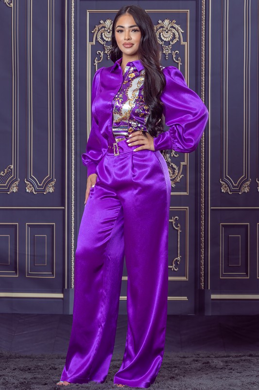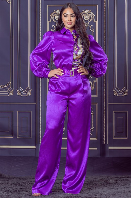 -Details: Puff Sleeve, Adjustable Belt, Side Pockets, Front Button Closure, Long Sleeve, Wide Leg, Collar, Long Sleeve.