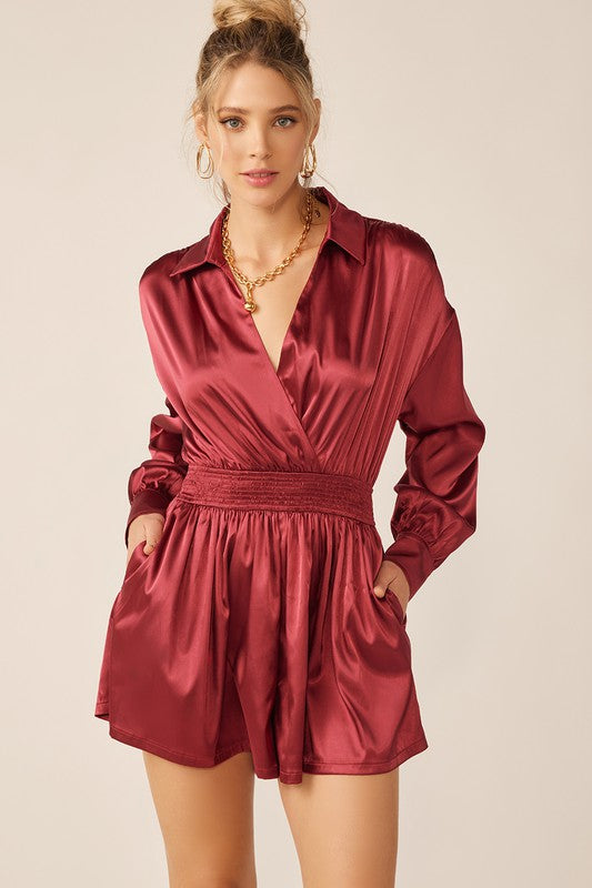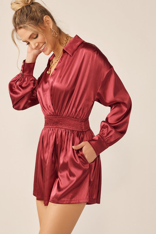 Red Dahlia Long Sleeve Silk Dress With Waist Banded In V Neck