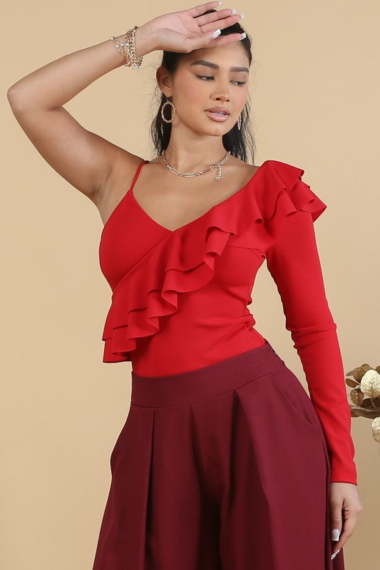 V Neck Solid Color Ruffled Chest One Long Sleeves Blouse Bodysuit. Model Wear S. Model: 5'8" 34-24-36. Made In Usa.Fabric Contents95% Polyester, 5% Spandex