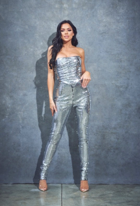 High Stretch Silver Sequin Set Featuring Our Signature Corset Style With Zipper Back Closure And High Rise Leggings With Zipper Back Closure And Zipper At Bottom Hem. Fully Lined Pieces. Sold As Set. Model Is 5'8" And Is Wearing Size Small In Both.