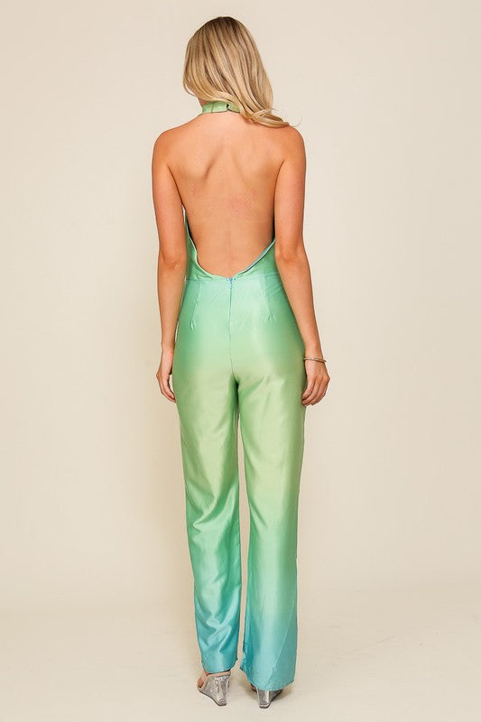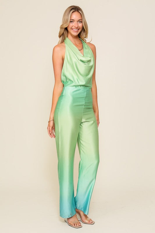 An Alluring Sleeveless Cowl Neck Jumpsuit Crafted From Opulent Ombre Dull Satin Material. Featuring An Elegant Halter Design That Accentuates The Shoulders And Neckline, This Chic Attire Radiates An Aura Of Sophistication. The Back Of The Jumpsuit Is Adorned With A Stunning Low Cute Detail, Exuding A Subtle Yet Tempting Charm. Its Cowl Neck Drapes Gracefully, Adding An Extra Touch Of Glamor And Mystique To This Already Mesmerizing Piece. Flaunt Your Fashion Sense With Pride, And Add This Timeless Classic To Your Wardrobe Collection.