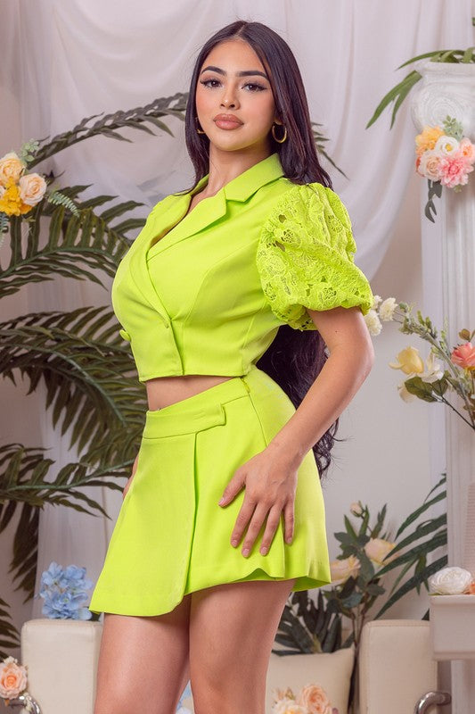 Lime Solid Lace Sleeve Jacket And Short Pants Set