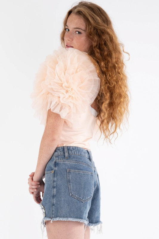 Solid Exaggerated Bodysuit With Mesh Ruffle Sleeves