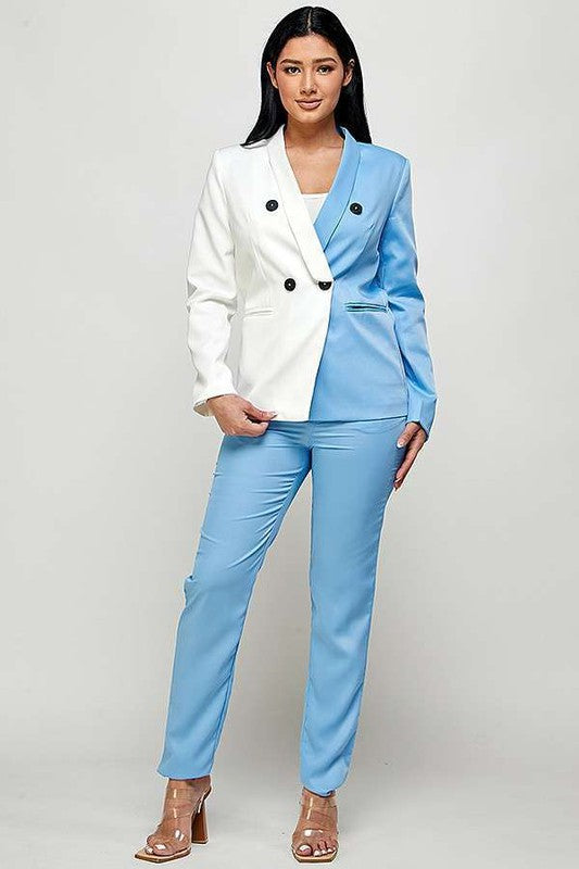 Blue/Ivory Two Tone Color Solid Blazer Pants Set