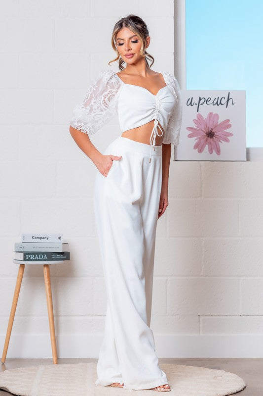 -Details: Wide Leg, Cropped, Eyelet Sleeve, Smocking Back, Sweetheart, Draw String, Side Pockets, Back Zipper, Elastic Back Waist Band, Mesh.