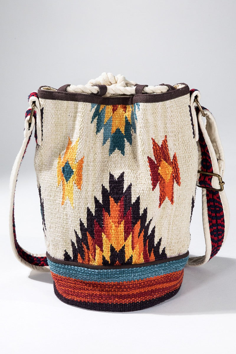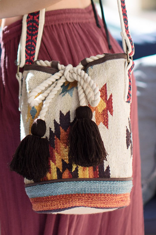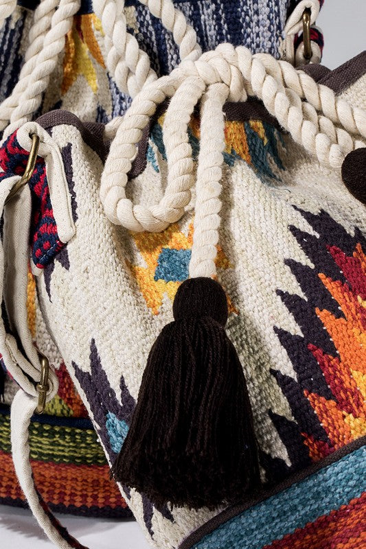 Handwoven Ethnic Navajo Pattern With A Rope And Tassel Closure And A Magnet Button Closure. Also, Features Adjustable Shoulder Strap And A Large Slip Pocket On The Inside Of The Fully Fine Cotton Bucket Shoulder Bag