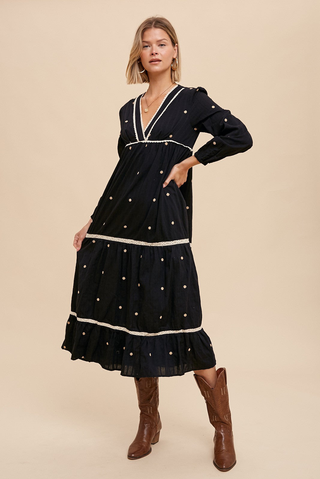 All Over Embroidery V Neck Tiered Midi Dress Features Lining, Lace Trim, V-Neck, Long Sleeve, Lining, And Side Invisible Zipper.