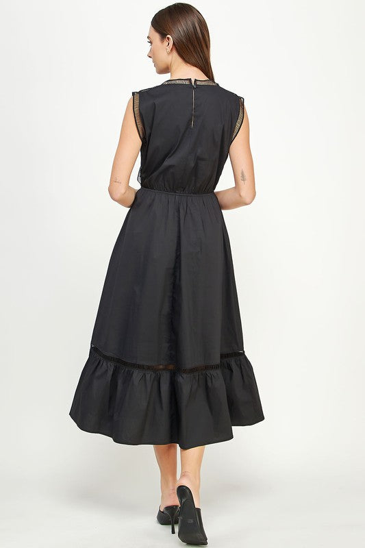 Ladder Trim Midi Sundress In Stretch Poplin Fabric. Fine Cutout Ladder Trim Adorns The Crew Neckline And Outerline Of Sleeveless Torso, And Creates A Two-Tier Skirt On This Midi Sundress- Featuring An Elastic Cinched Waist, Side Seam Pockets, And Button Back Closure.
