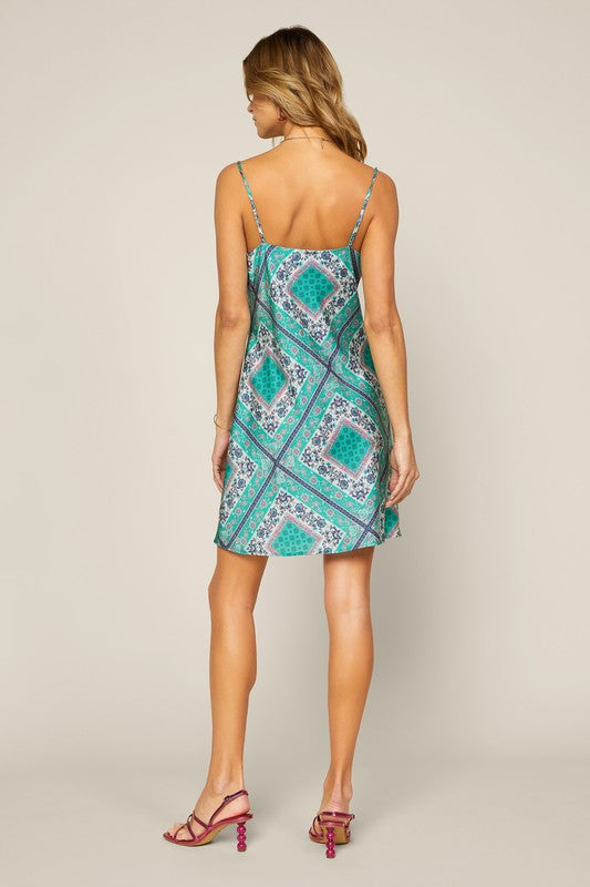 Skies Are Blue | Sleeveless Cowl Neck Satin Paisley Print Mini DressModel Is: Height: 5'8 1/2 Bust: 32" Waist: 24" Hip: 34 | Model Wears Size Small. Fabric Contents100% Polyester