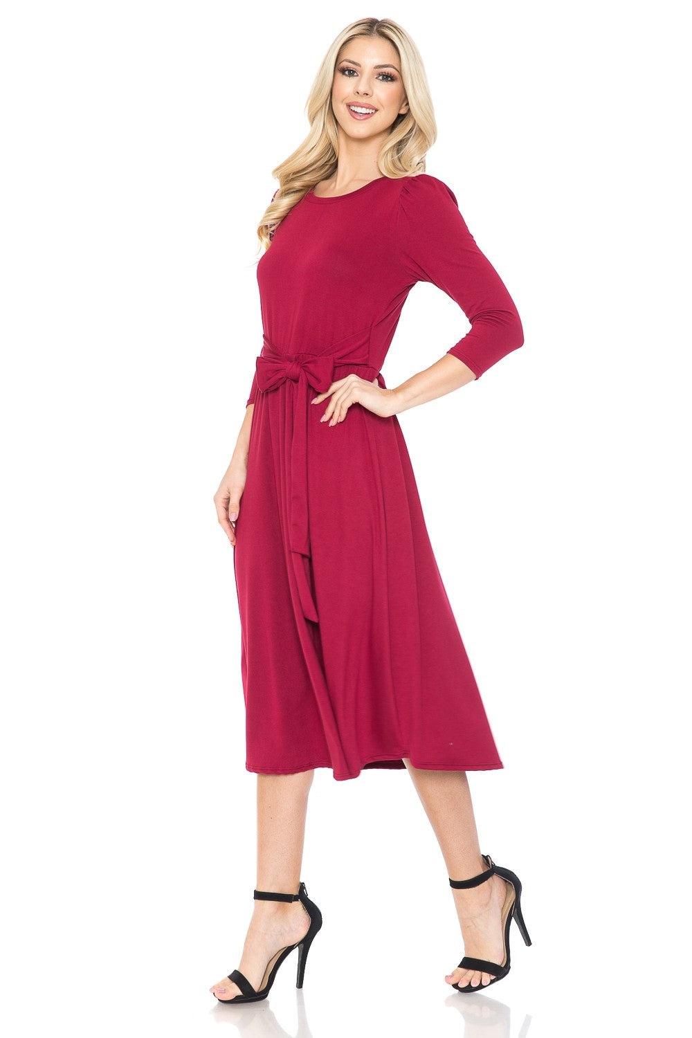 Burgundy A-Line Midi Dress With Shirred Shoulder