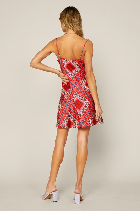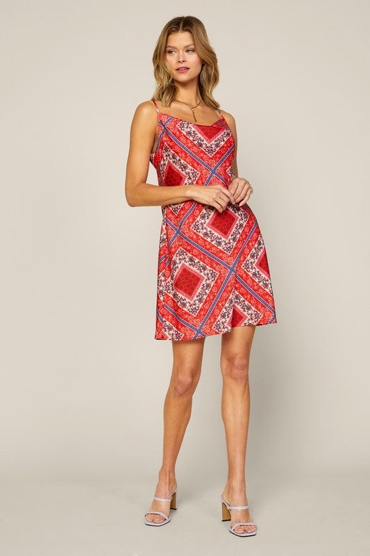 Red Navy Cami Cowl Neck Satin Paisley Print Mini Dress