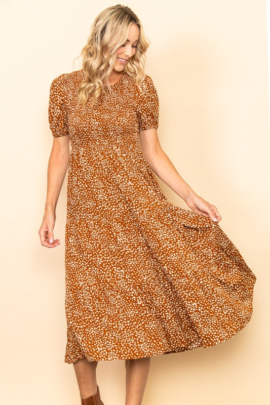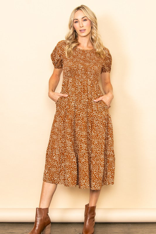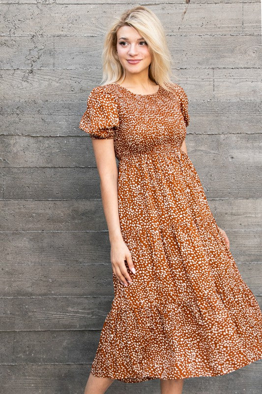 Copper Smocked Chest Puff Sleeves Tiered Midi Dress