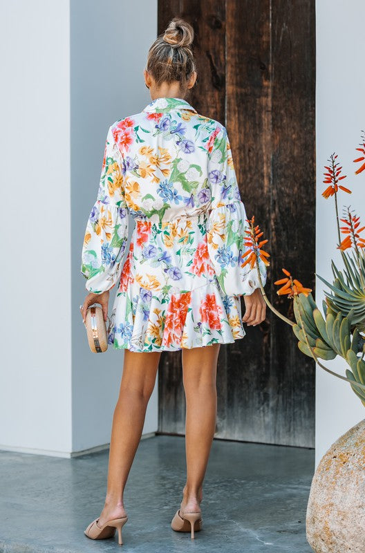 - Floral Print Billowy Fit Mini Flowy Skrit- Split Neckline - Long Sleeves With Elastic Cuffs - Drawstring Waistband - Front Button Closures - Lined Skirt Only- Unlined Top & Sleeves