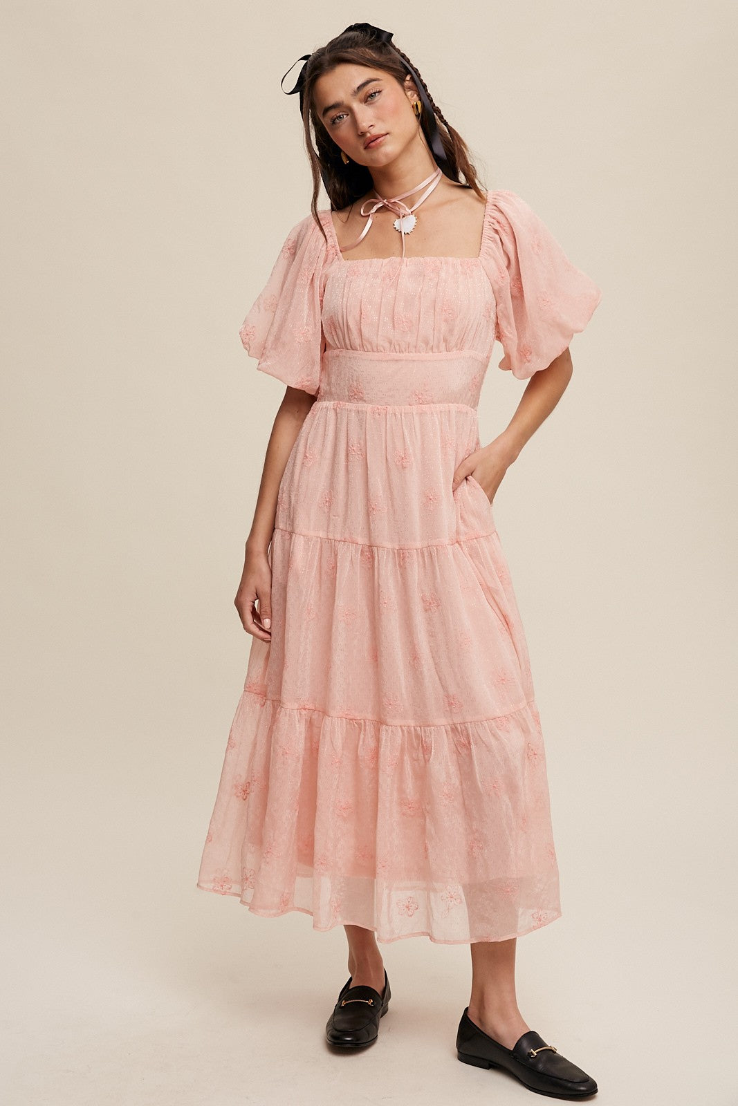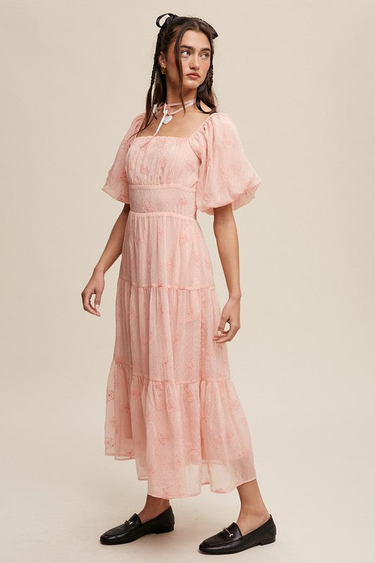 - Flower Embroidered Mesh Puff Sleeve Tiered Maxi Dress