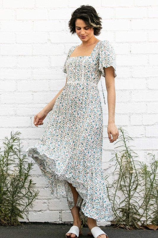 Cream Flutter Sleeve Floral Flowy Maxi Dress