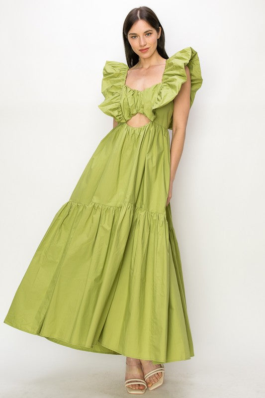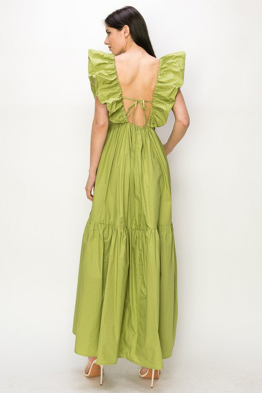 Green Cotton Ruffle Shoulder Tiered Sleeve Maxi Dress