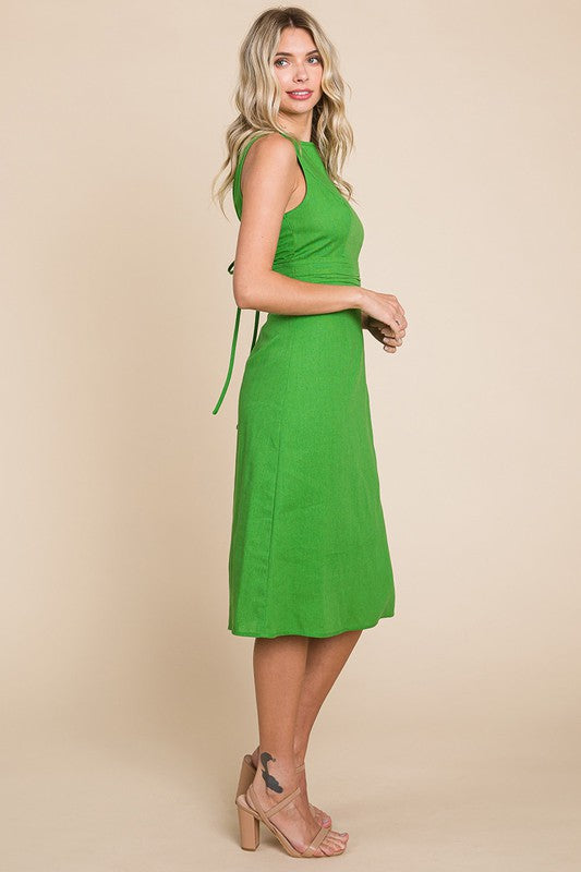 Green Sleeveless Tied Backless Pleated Midi Linen Dress