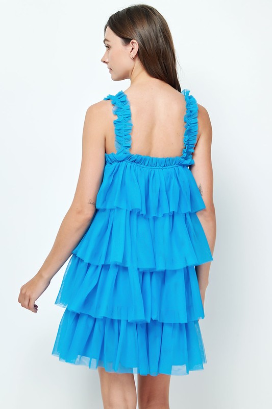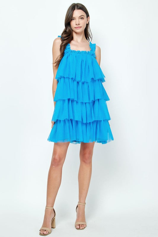 Tiered Mini Dress In Tulle Fabric. With Ruffle Adorned Elasticated Ruched Tank Straps And A Square Neckline, This Mini Dress Features Tiers Of Ruffled Tulle In A Relaxed A-Line. Perfect For A Cocktail, Bridal Shower, Or A Night Out.