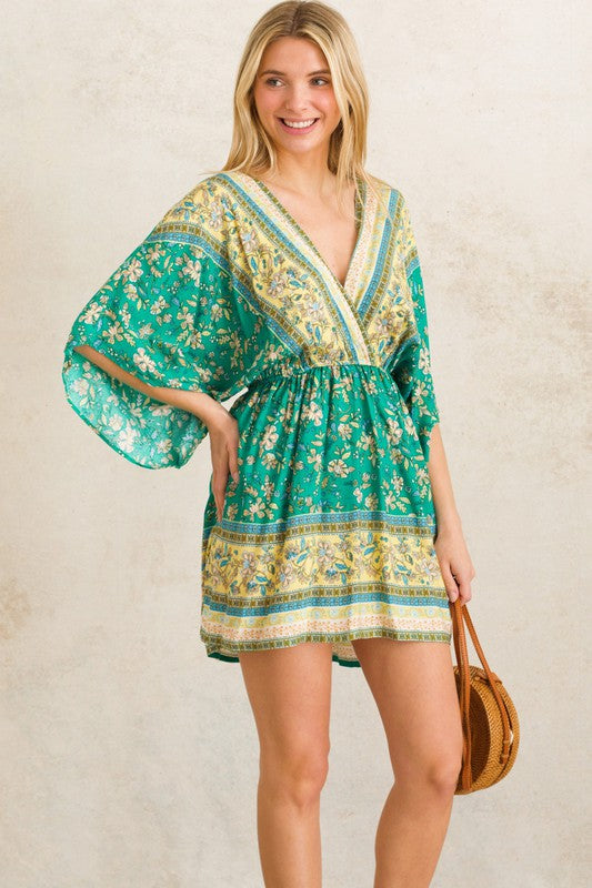 Jade Boho Floral Print Kimono Sleeve Summer Mini Dress