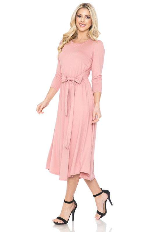 Dress Features Banded Round Neckline, Three-Quarter Sleeves, Shirring Detail Around Shoulder, Full Skirt, Waist Tie And Pullover Style.Fabric Contents95% Polyester 5% Spandex