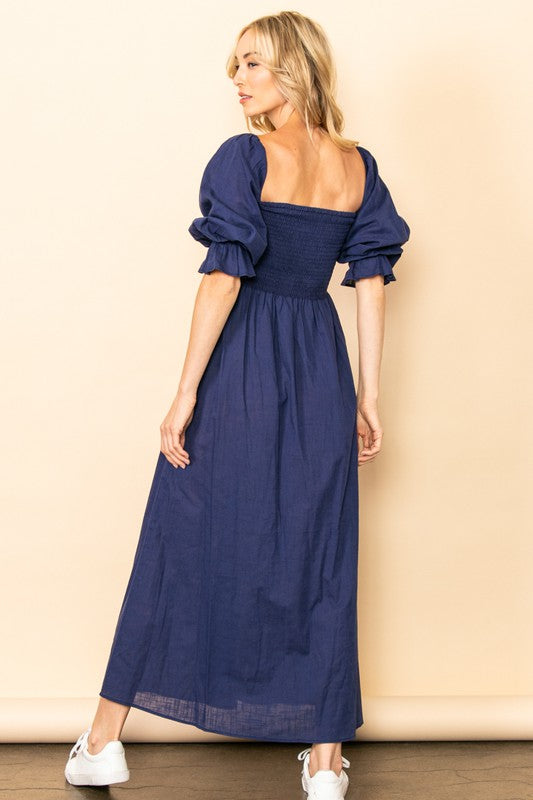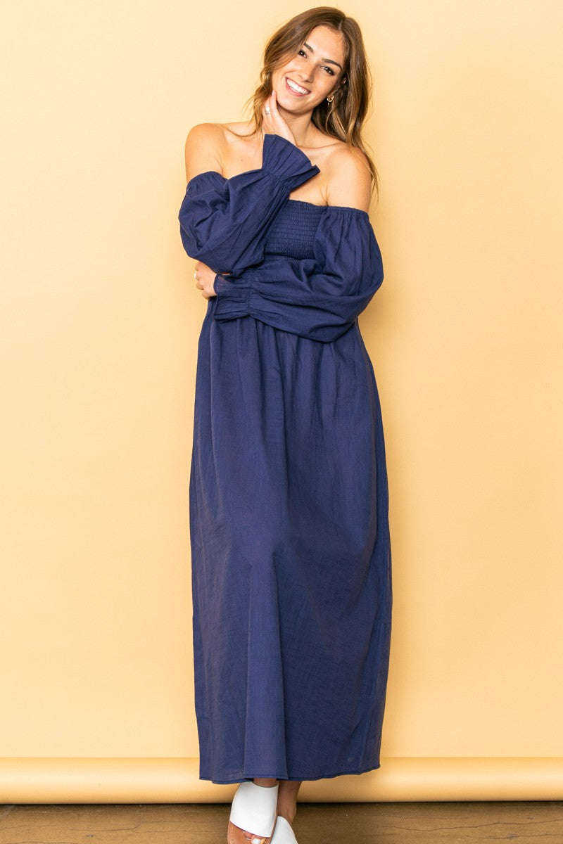 Midnight On And Off Shoulder Smocked Chest Maxi Linen Dress