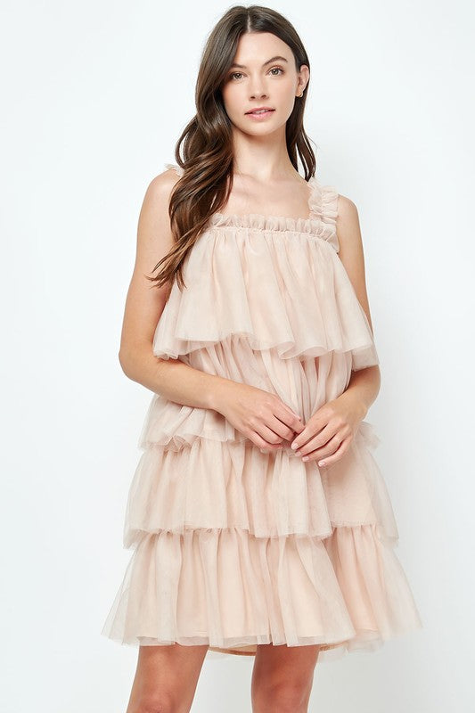 Tiered Mini Dress In Tulle Fabric. With Ruffle Adorned Elasticated Ruched Tank Straps And A Square Neckline, This Mini Dress Features Tiers Of Ruffled Tulle In A Relaxed A-Line. Perfect For A Cocktail, Bridal Shower, Or A Night Out.
