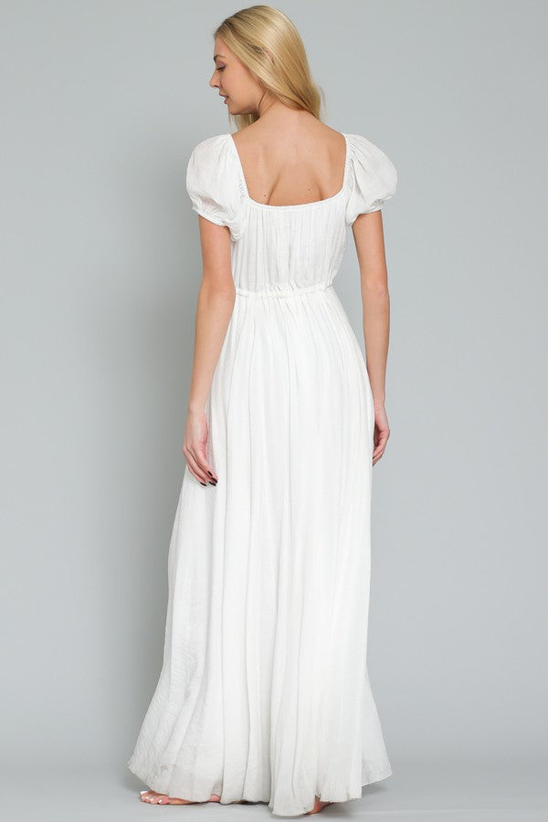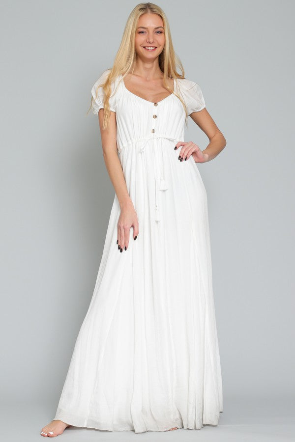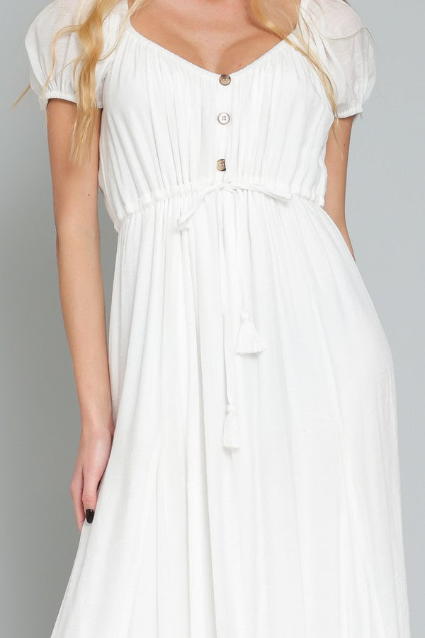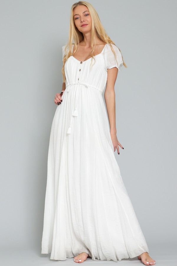 White Off Shoulder Short Sleeve Tie Front Waisted Maxi
