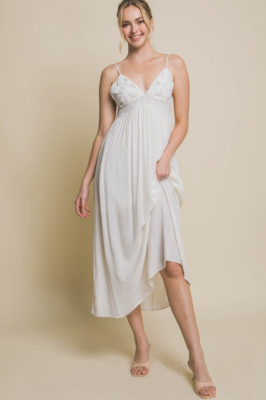 Off White Spaghetti Strap Midi Dress With Flower Design