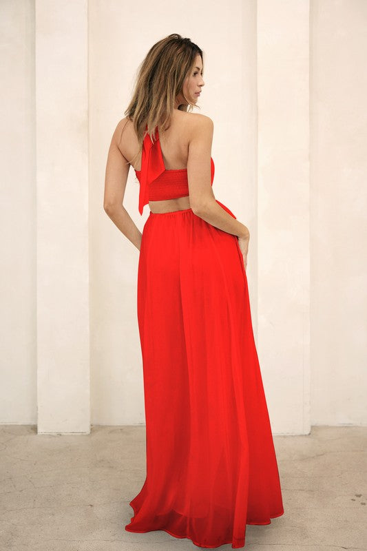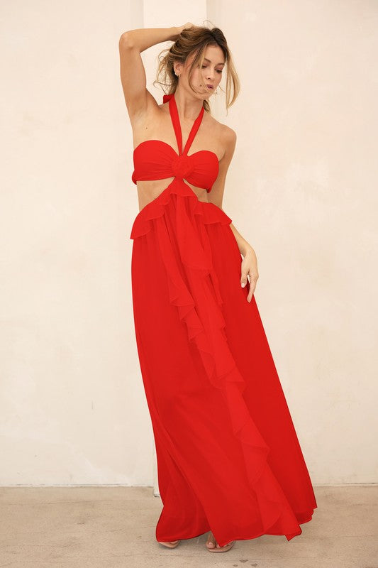 Rosette Detail Cut-Out Ruffled Maxi Dress. Neck Tie And Smocking In The Back.Fabric ContentsSelf:100%Polyester Lining:100%Polyester