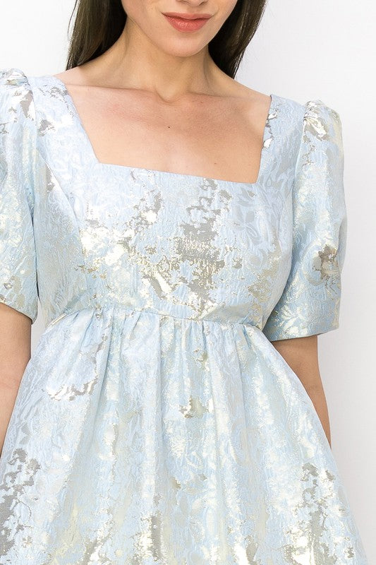 Square Neck Puff Short Sleeve Jacquard Glitter Baby Doll Mini Dress
