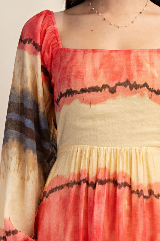 Tie Dye Square Neck Midi Dress With Side Pockets. Back Features Smocked Panel