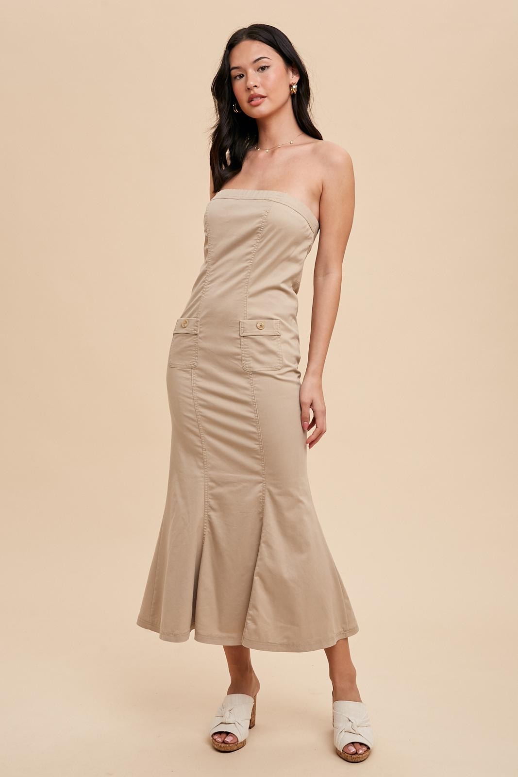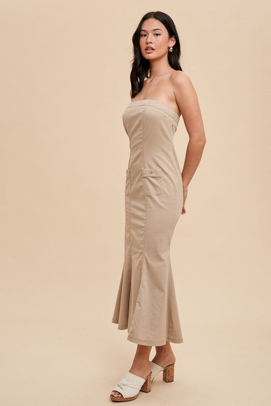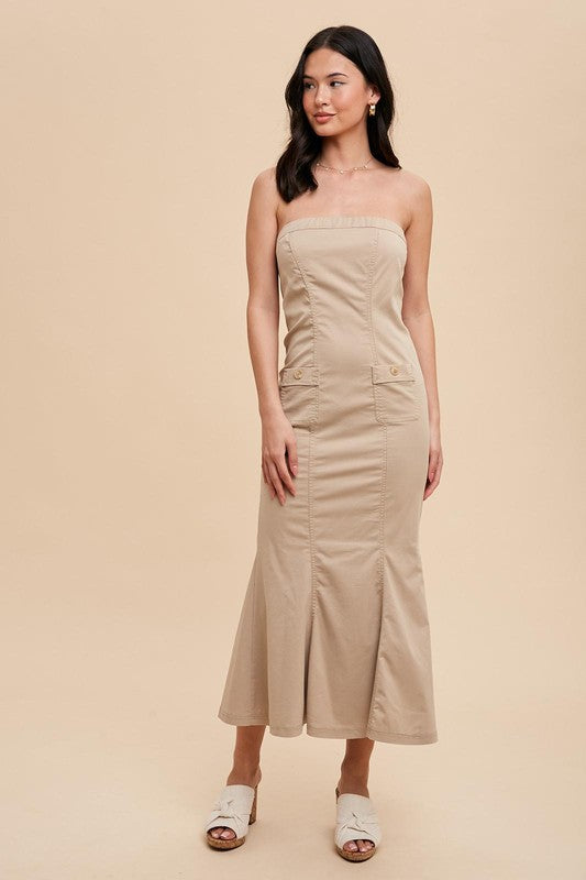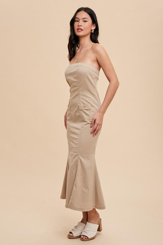 Utility Tube Dress Features Garment Washed Tencel/Cotton Blend Fabrication, Slight Flared Skirt, Functional Utility Pockets, Anti Slip Grip Trim at Bust and Back Zipper. Shoulder Straps Are Removable to Make into a Tube Dress. Dress Is Fully Lined.