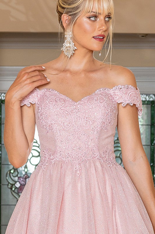 Blush Off Shoulder Lace Top Glitter Cocktail Dress