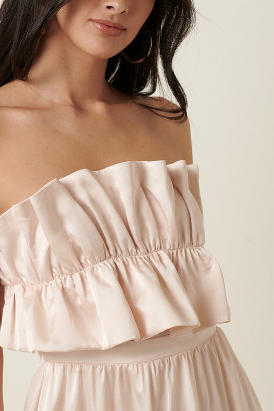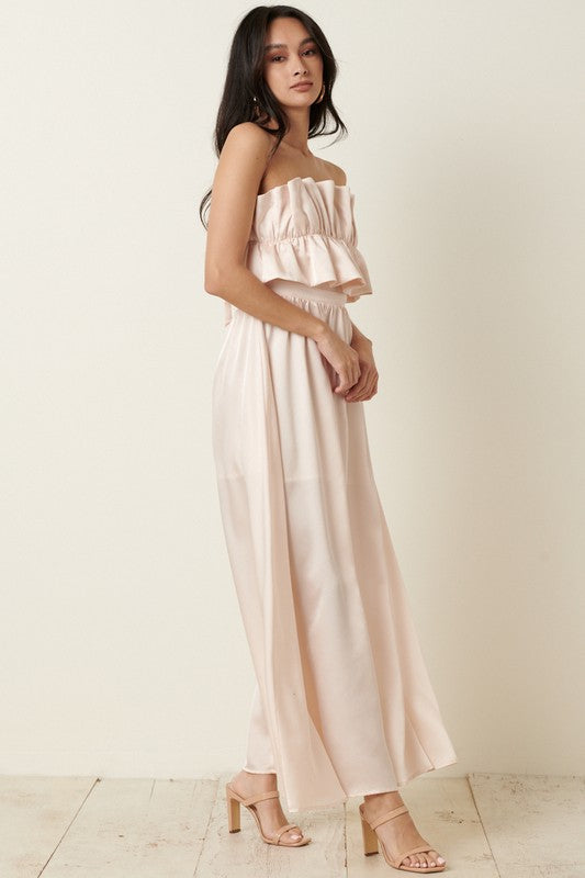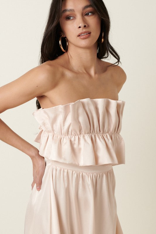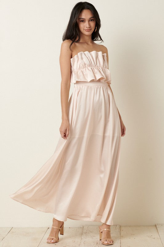 Champagne Satin Ruffle Bust With Tie Back Maxi Dress