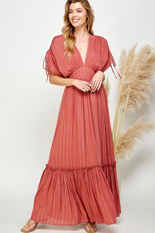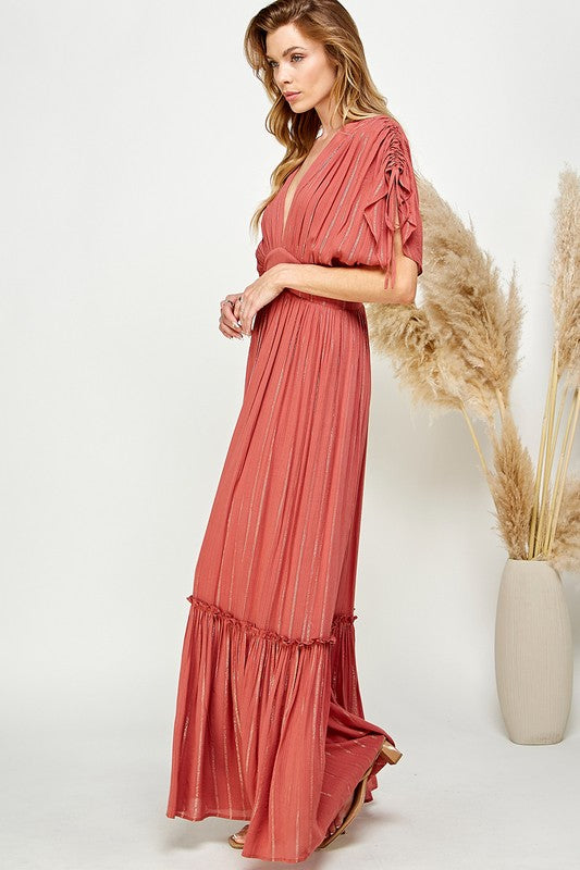 Ruched Tiered V Neck Lurex Insert Maxi DressModel Is Wearing Small, 5' 10" 33 - 25 - 34Fabric Contents100% Rayon