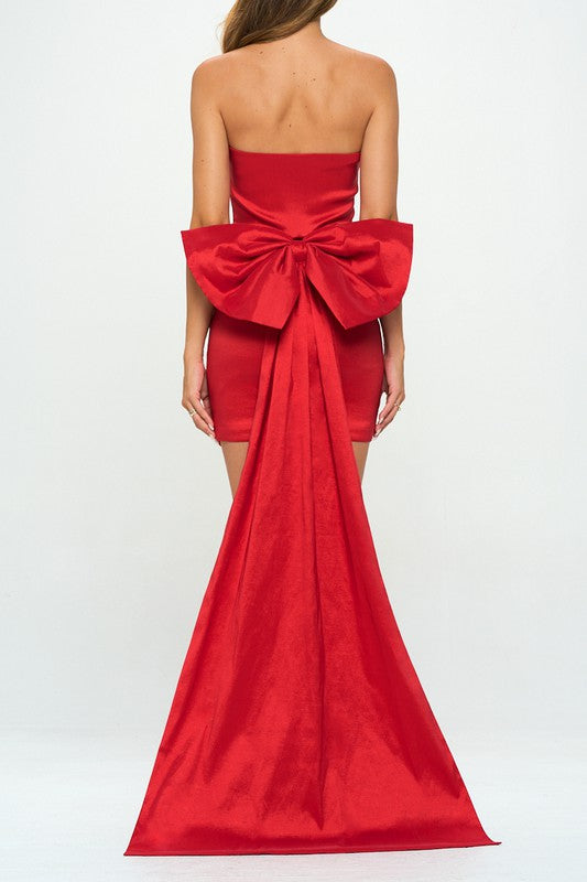 Taffeta- Cinching Throughout The Front- Back Bow With Long Train (bow Is Detachable And Held By Four Buttons)- Back Zipper W/ Hook- Boning On The Top Sides- Bodycon Mini DressFabric 65% Rayon 30% Nlyon 5% Spandex