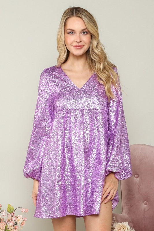 Lavender Festive Sequin Babydoll Mini Dress